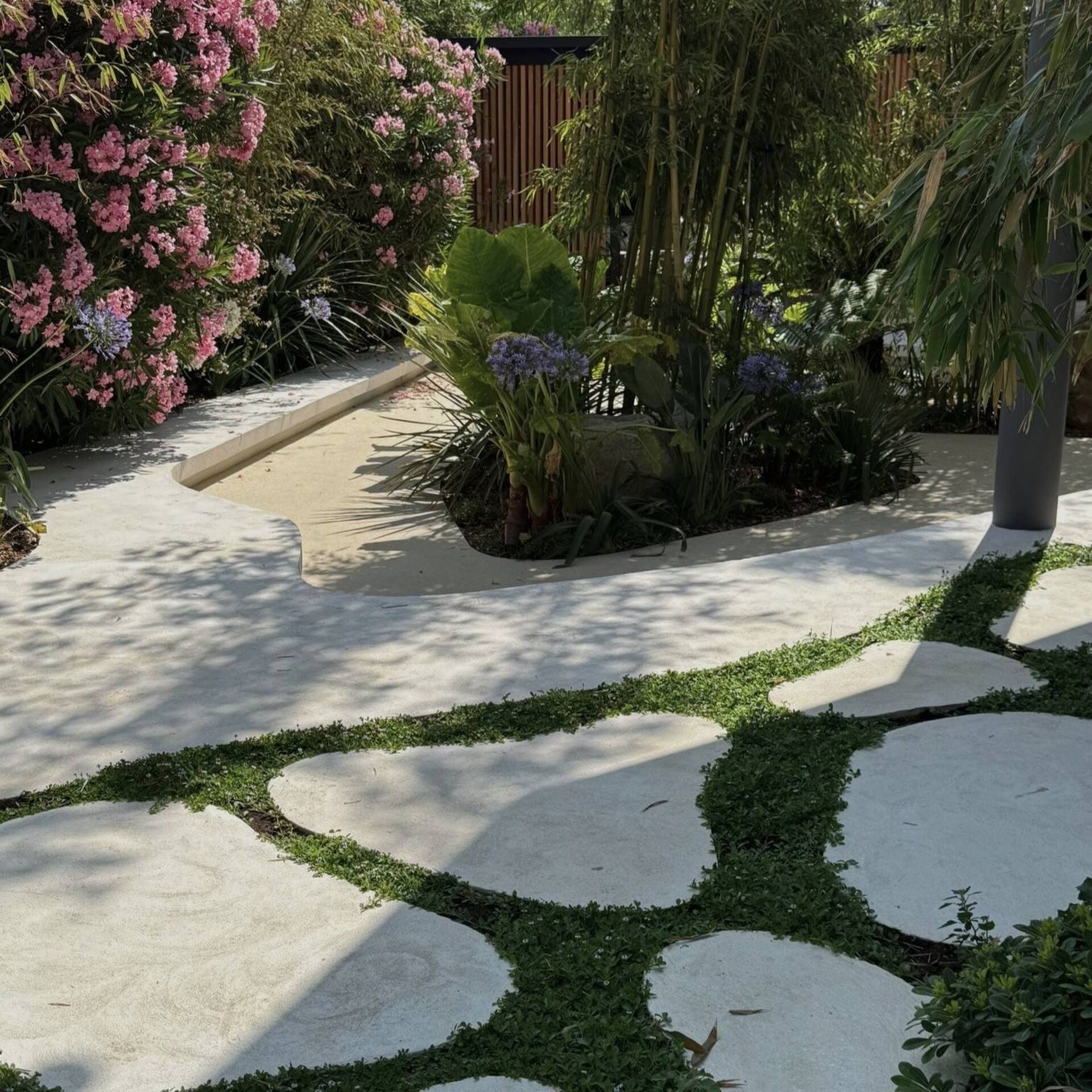 L’agencement s’organise autour de plusieurs zones fonctionnelles, reliées par des accès en pas japonais entouré de végétation tapissante. Le bois, la pierre naturelle et les revêtements minéraux clairs créent un contraste subtil avec les feuillages denses et variés.