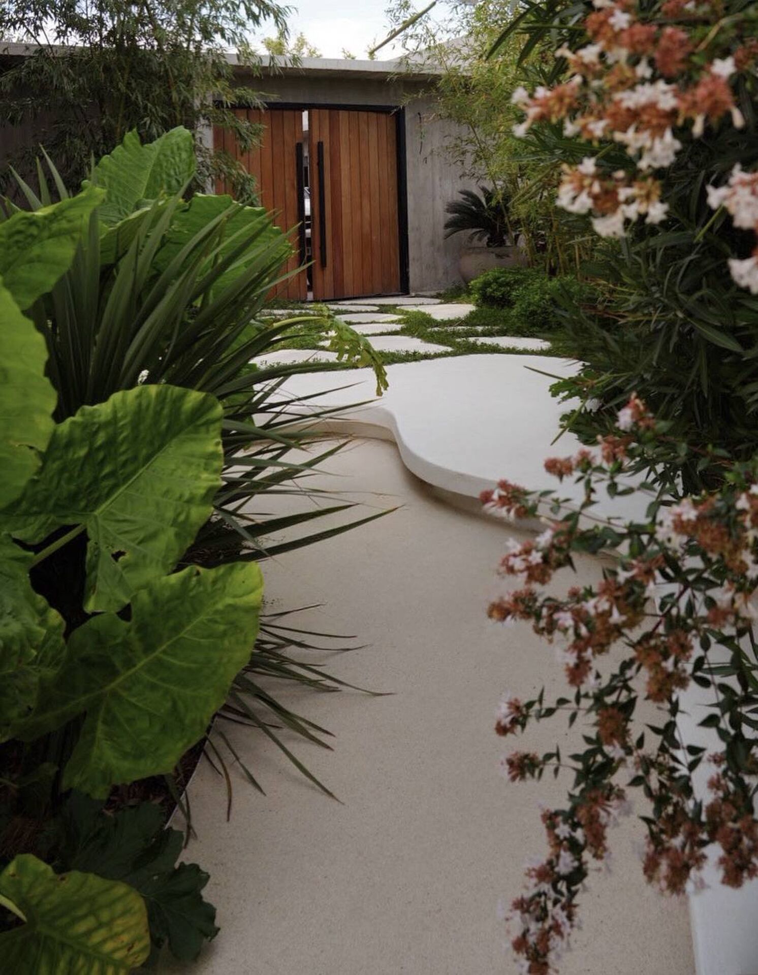 Les allées ont été conçues avec un revêtement clair et lisse, aux formes douces, inspirées du design zen. Le sol est drainant, stabilisé et conçu pour être pérenne sans entretien lourd. L’arrosage est totalement automatisé et adapté à chaque zone du jardin.
