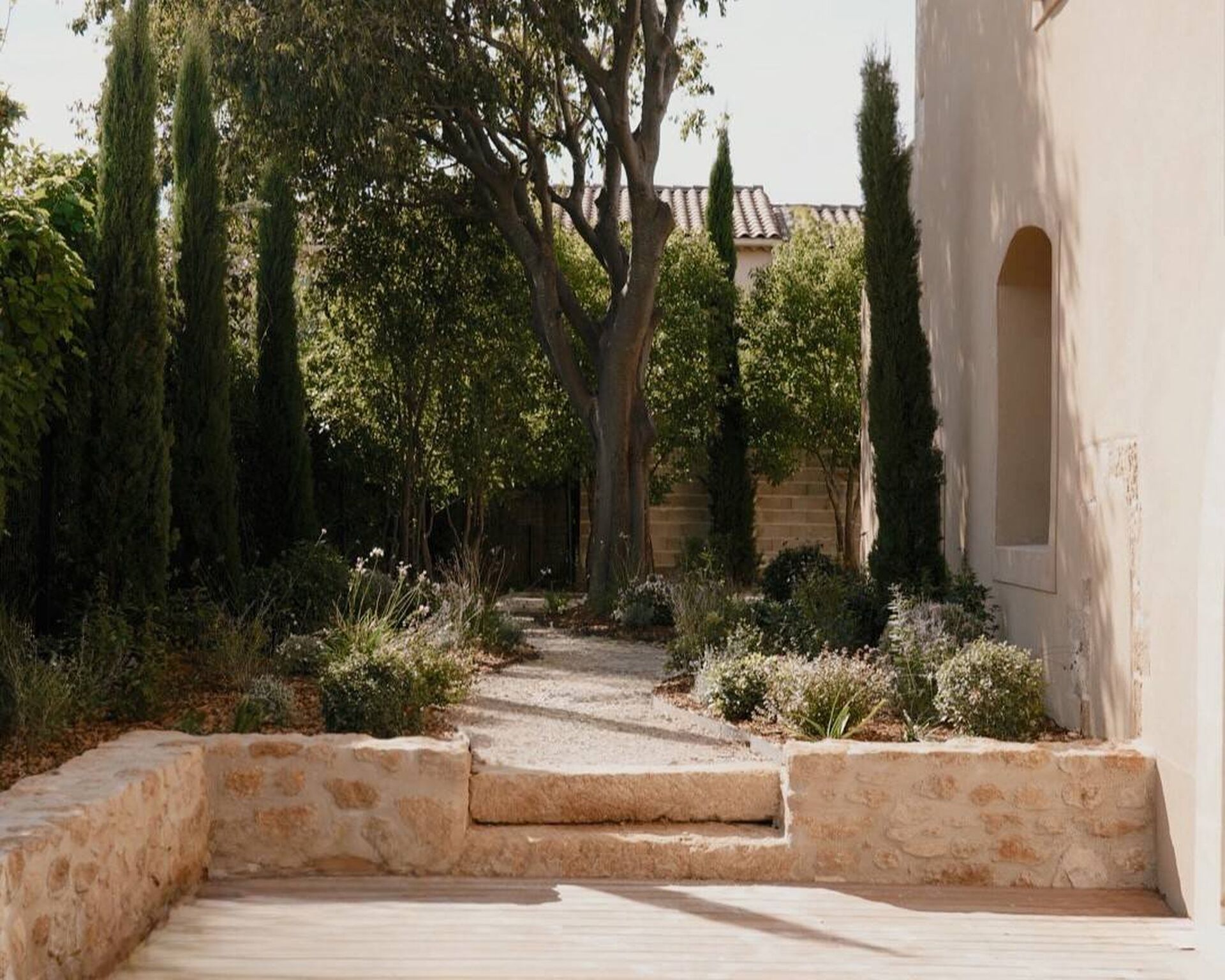 L’allée principale, réalisée en gravier stabilisé, guide le regard depuis la terrasse jusqu’au fond du jardin. Elle s’intègre naturellement dans le décor, sans effet de rupture. Les différences de niveau ont été gérées par de petits emmarchements en pierre, confortables à franchir, qui renforcent la lecture du paysage.