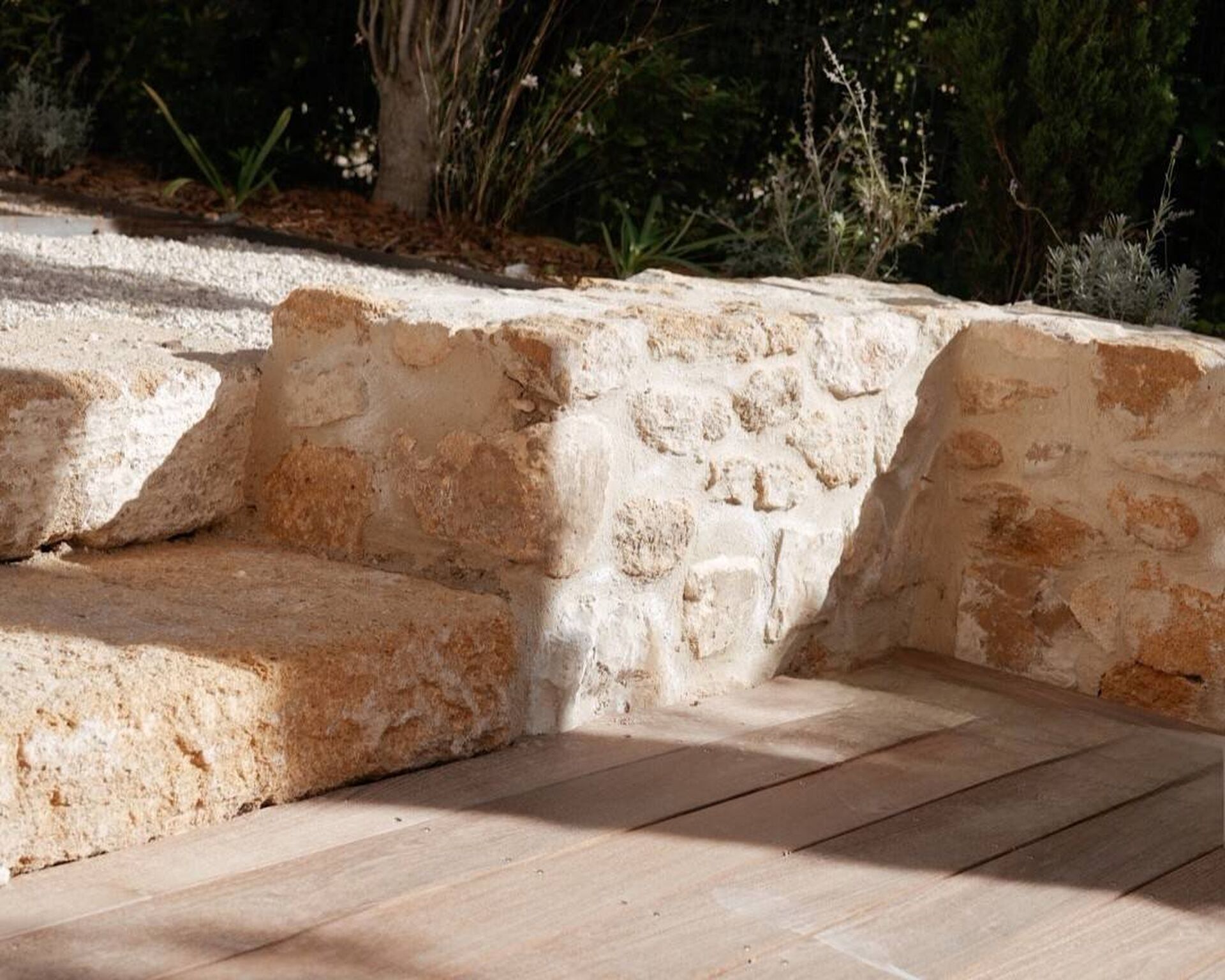 En contrebas, une terrasse bois vient adoucir l’ensemble tout en apportant un confort d’usage. L’association bois/pierre est un classique de l’aménagement paysager, ici interprété dans une version sobre et contemporaine.